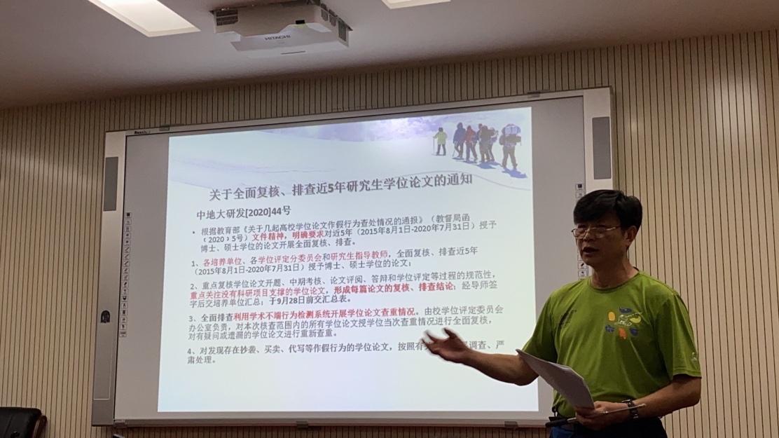 会议的第二项是传达了2020年7月举行全国研究生教育会议和国务院学位委员会第三十六次会议基本情况,杨汉副院长带领全体师生重点学习了习近平总书记关于研究生教育工作的重要指示精神,李克强总理的重要批示,学习了孙春兰副总理关于扎实做好研究生教育五方面的重点工作要求,和教育部长陈宝生关于研究生教育围绕“内涵建设”和“质量提升”过五关举措等重要会议精神。