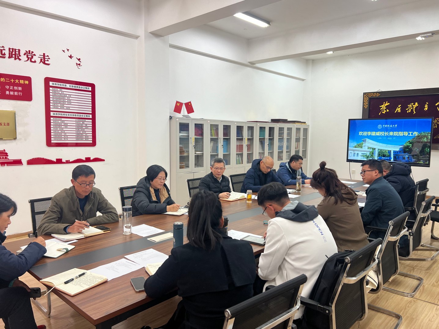 李建威校长讲话。他首先感谢后宫电影院 师生多年来为学校作出的努力与贡献,在听取了参会人员对学院工作的介绍以后,谈了几点体会和想法:第一,大家要继续深入学习贯彻落实二十届三中全会精神、全国教育大会精神,把教育强国建设落实到每个人的具体工作中;对标“十四五”规划,抓好各项目标任务的落实。第二,学院发展处于关键时期,要找准学院发展定位,发展院本体育特色,做到有位有为。第三,要重视以体育人工作,从多角度来考虑学校体育工作的布局与改革重点,让更多的学院、更多的师生参与体育工作,举全校之力推进五育并举,培养德智体美劳全面发展的高素质人才。第四,要加强系统谋划与顶层设计,在高水平运动队建设、专业建设、教师评价等方面深入开展调查研究,作好论证报告,供学校决策。第五,要强化班子建设,班子成员要经常学用结合、虚实结合讨论学院工作,既分工又协作,发挥头雁作用,为全院做出榜样和示范。