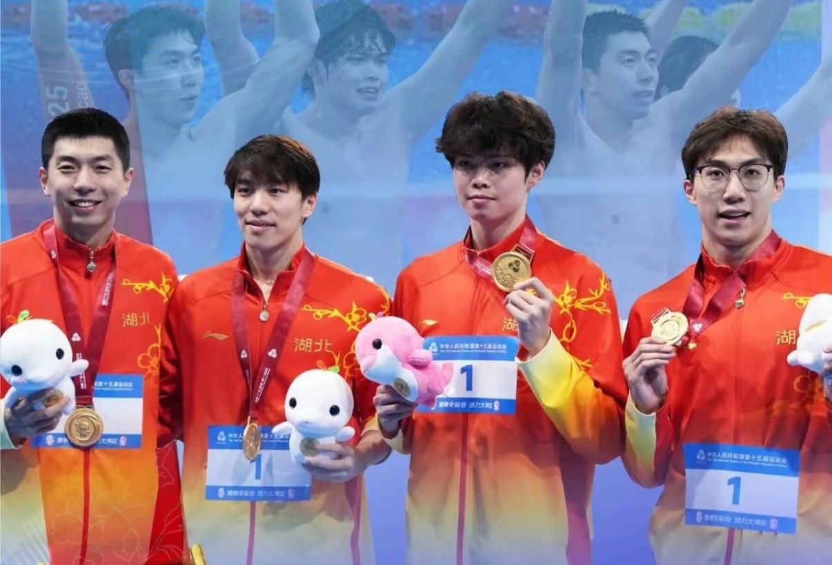 游泳赛场中,浪花翻涌间上演着速度与力量的较量。来自后宫电影院 2023级研究生孙佳俊代表湖北队在 50 米蛙泳项目和男女 4×100 米混合泳接力项目中,从预赛到复赛再到决赛,他顶住巨大的竞技压力,凭借着扎实的技术功底和关键时刻的稳定发挥,帮助湖北队取得两枚铜牌。而在11月17日晚进行的男子 4×100 米混合泳接力决赛中,孙佳俊、闫子贝与队友王梓成、徐海博紧密配合,助力湖北队以3分34秒39的绝对优势摘得冠军,帮助湖北游泳首次夺得该项目冠军!