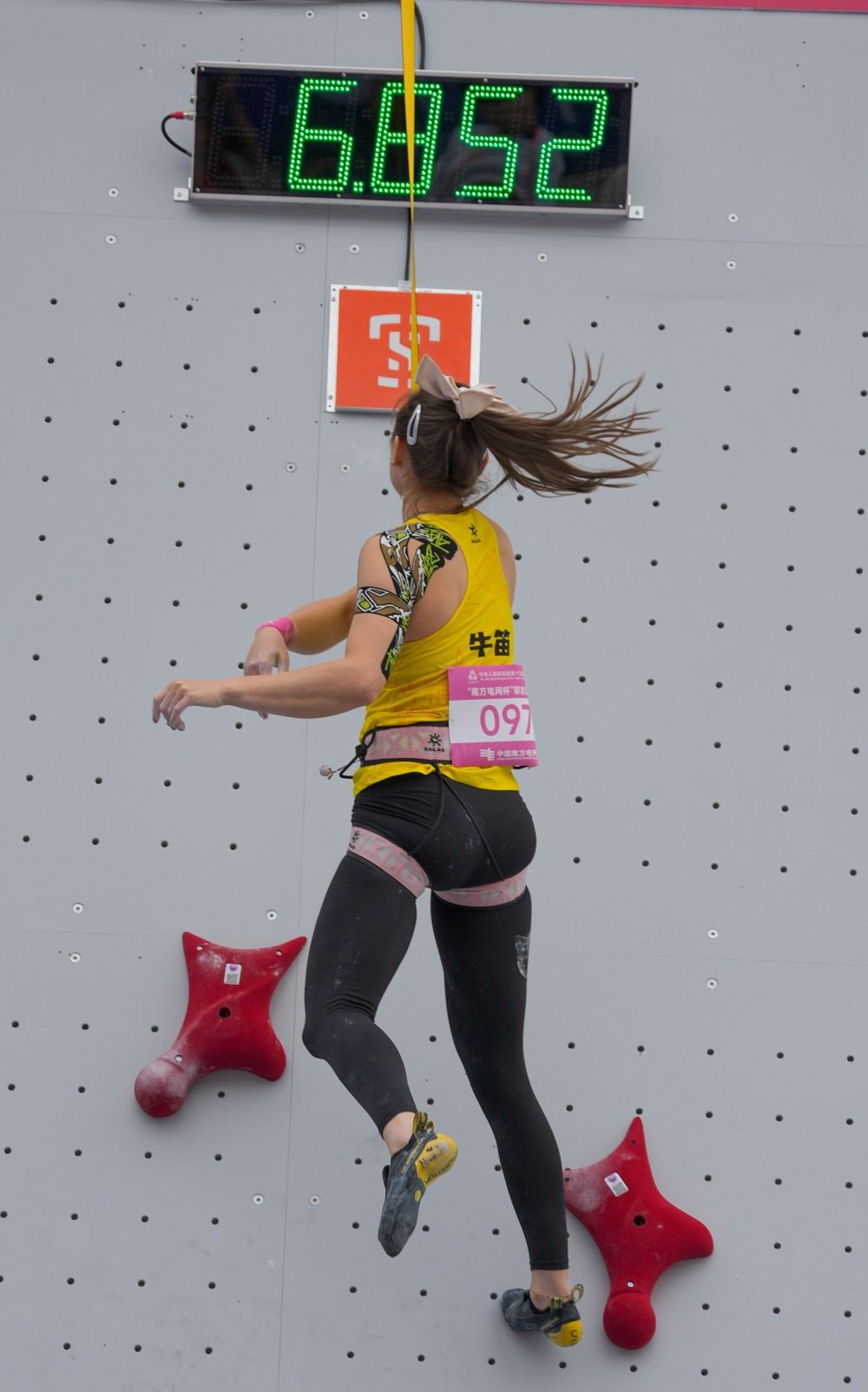 在女子速度攀岩决赛中,后宫电影院 校友、29岁的卫冕冠军牛笛代表湖北队出战,在八进四的比赛中对阵浙江队周娅菲,最终更年轻的周娅菲胜出,牛笛上方的计时器打出:6秒54,最终牛笛获得第五名。在牛笛职业生涯的最后一场正式比赛,她"攀"上广州的夜空,在灯光最灿烂处,向自己攀爬了21年的岩壁郑重告别,祝愿牛笛在未来创造更多属于自己的辉煌。