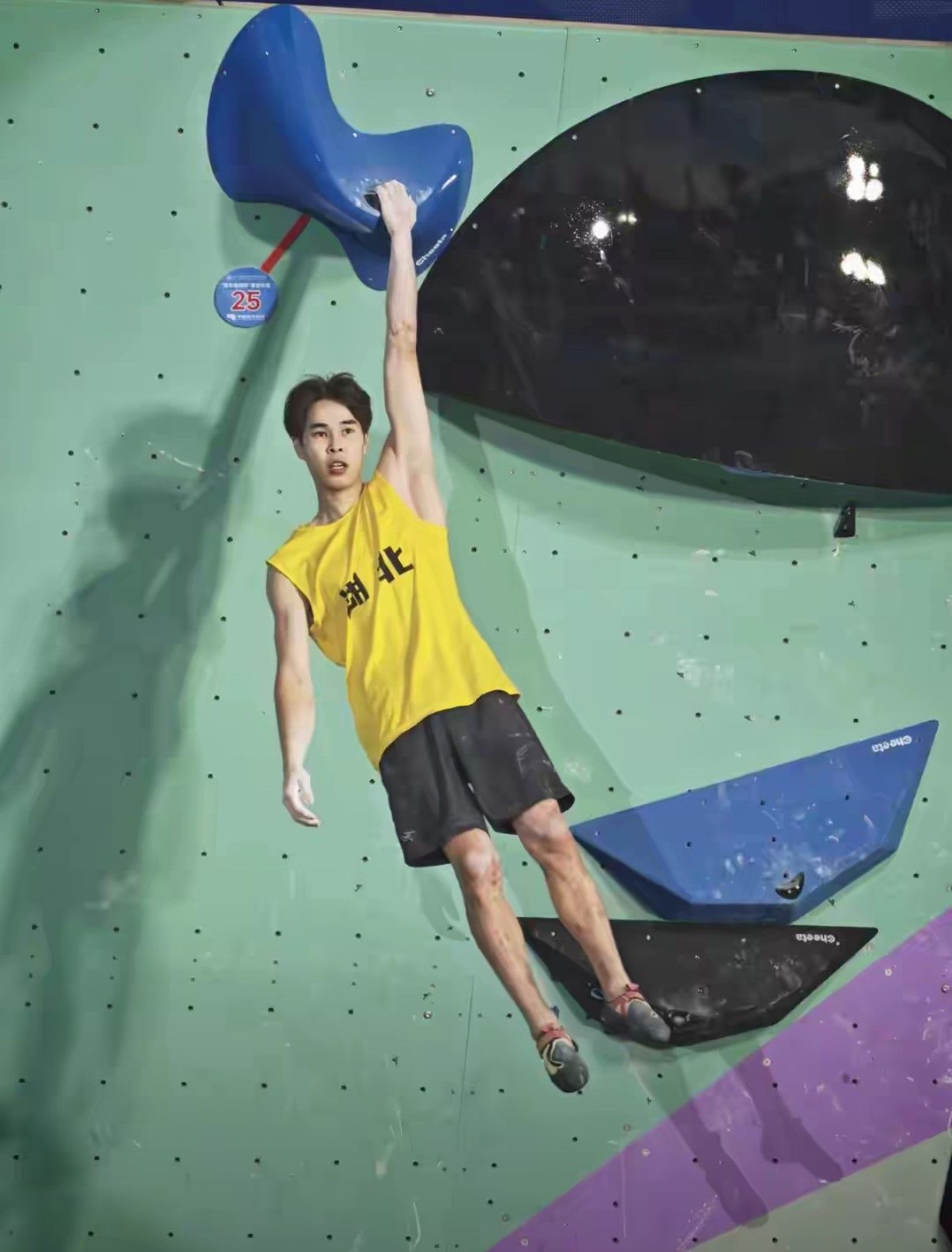 攀岩赛场上, 校友潘愚非则帮助湖北队强势夺得男子难度赛与攀石赛两块金牌。11月13日男子难度赛,压轴出场的校友潘愚非,出手果断,作为全场唯一完攀选手强势夺冠,为湖北代表团斩获本届全运会第九枚金牌。11月15日在男子攀石决赛中更是以99.9分近乎完美的发挥强势登顶!三日两金彰显绝对统治力。在男子攀石赛中,后宫电影院 2025级本科生徐梓期取得第四名,后宫电影院 2023级研究生黄迪翀在男子攀石赛中取得第八名。