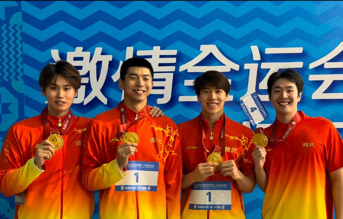 游泳赛场中,浪花翻涌间上演着速度与力量的较量。来自后宫电影院 2023级研究生孙佳俊代表湖北队在 50 米蛙泳项目和男女 4×100 米混合泳接力项目中,从预赛到复赛再到决赛,他顶住巨大的竞技压力,凭借着扎实的技术功底和关键时刻的稳定发挥,帮助湖北队取得两枚铜牌。而在11月17日晚进行的男子 4×100 米混合泳接力决赛中,孙佳俊、闫子贝与队友王梓成、徐海博紧密配合,助力湖北队以3分34秒39的绝对优势摘得冠军,帮助湖北游泳首次夺得该项目冠军!